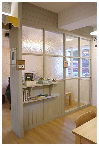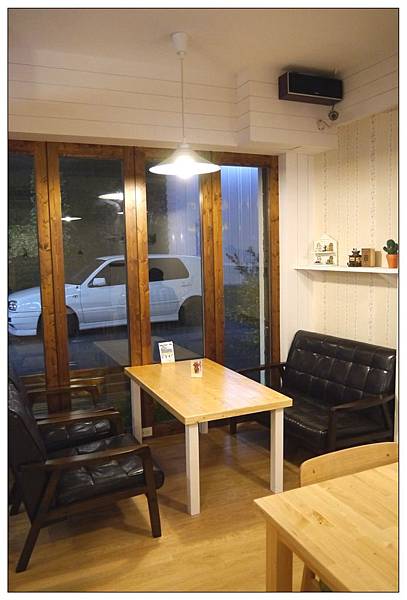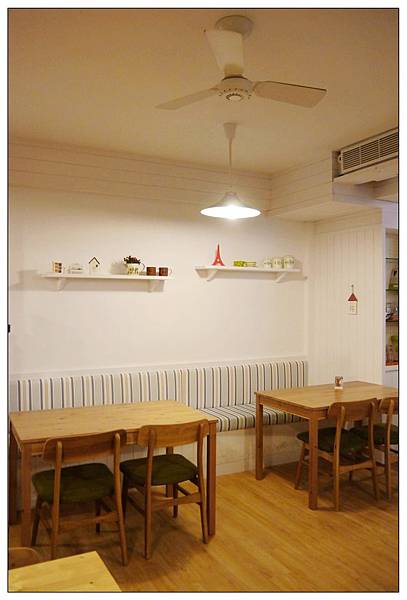 店內裝潢主要以純白色牆面為主~~搭配上淺色木質桌椅及木地板~~