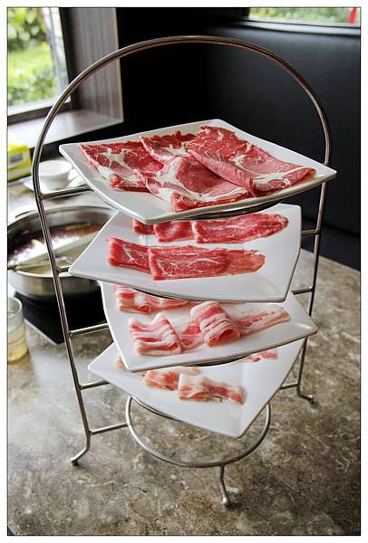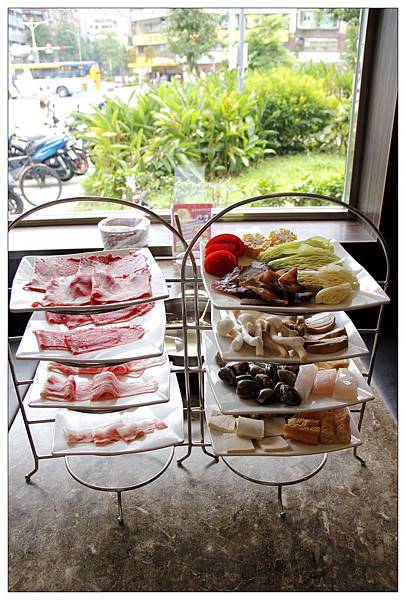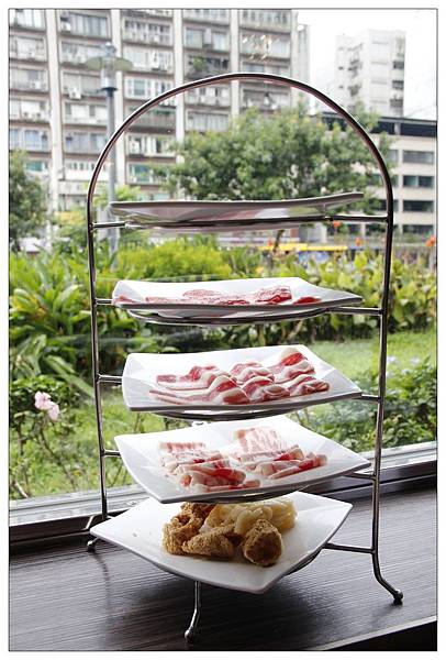 一盤盤新鮮的火鍋料用英式下午茶架裝盛著