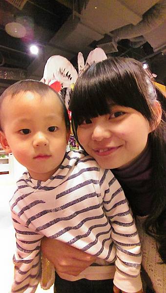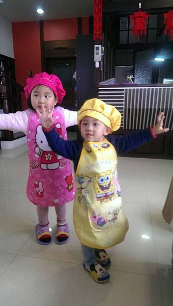 看到姐姐穿圍兜戴帽子小傢伙也很乖的給阿姨穿戴上