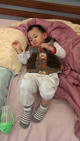 一早起床因為媽媽還在廁所拉肚子~小傢伙乖乖地躺在床上碎碎念好久