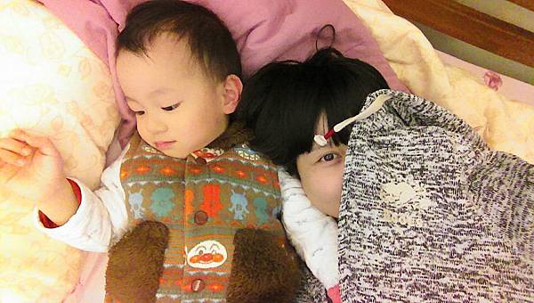 臭小子還不肯睡~自己在床上滾來滾去~還好沒滾多久就睡著了