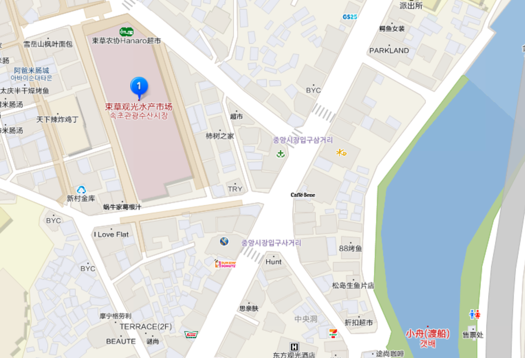 交通方式:束草市外巴士客運站搭乘1、1-1、7、7-1、9-1、88號公車至觀光水產市場下車