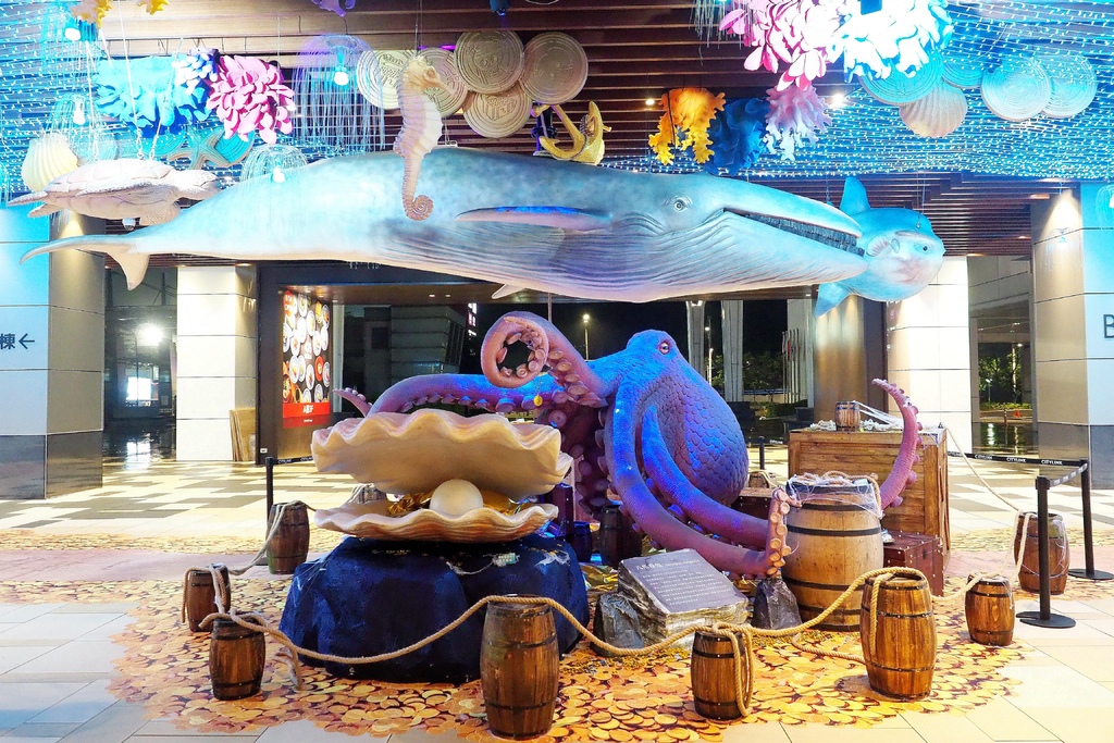 位於AB棟中間廣場的大型深海裝置藝術有藍鯨.八爪大章魚.珍珠貝.藏寶箱等