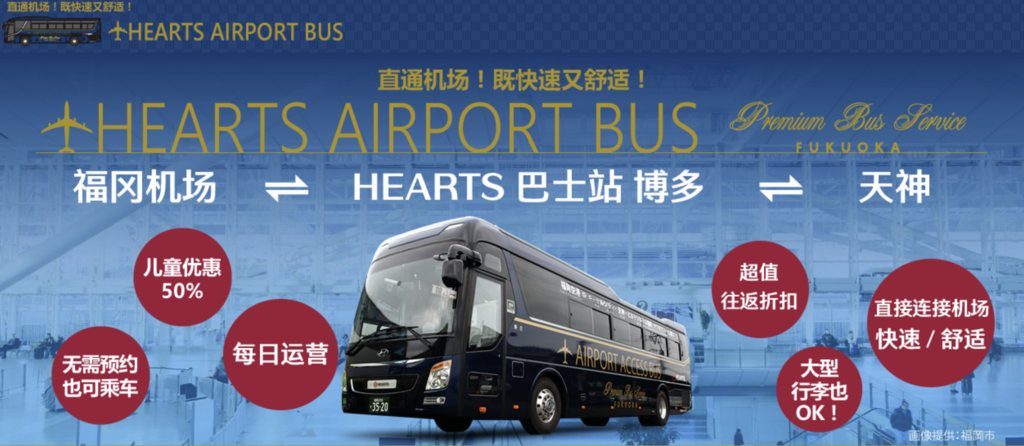 這班機場巴士是往返於福岡機場.HEARTS 巴士站博多以及天神之間