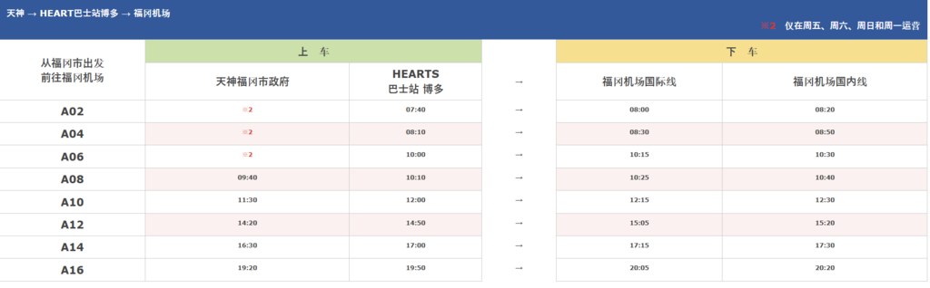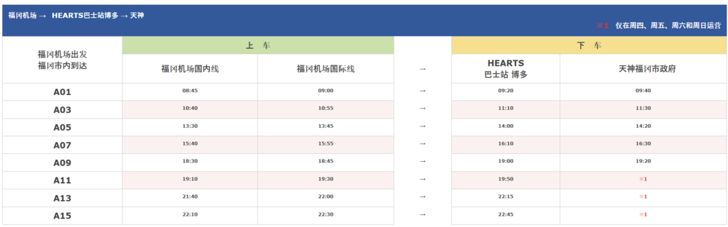 要注意的是A11.A13.A15這三班車是只有周四~週日才會開到天神福岡市政府