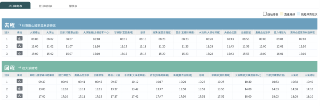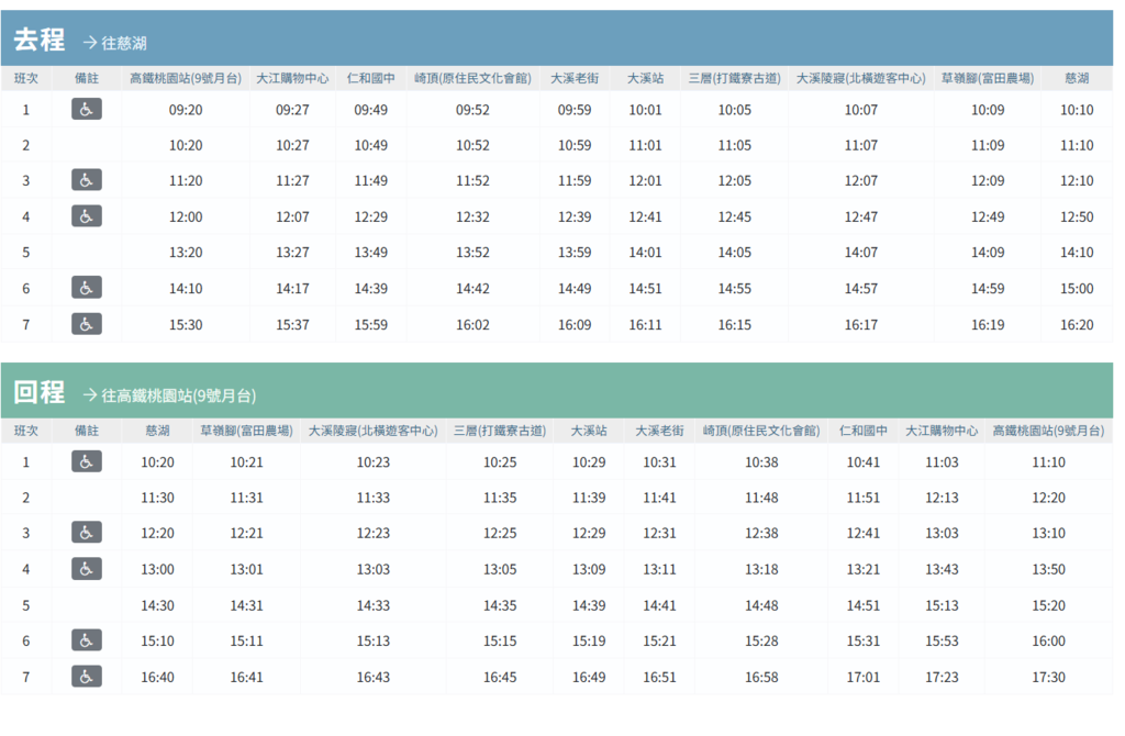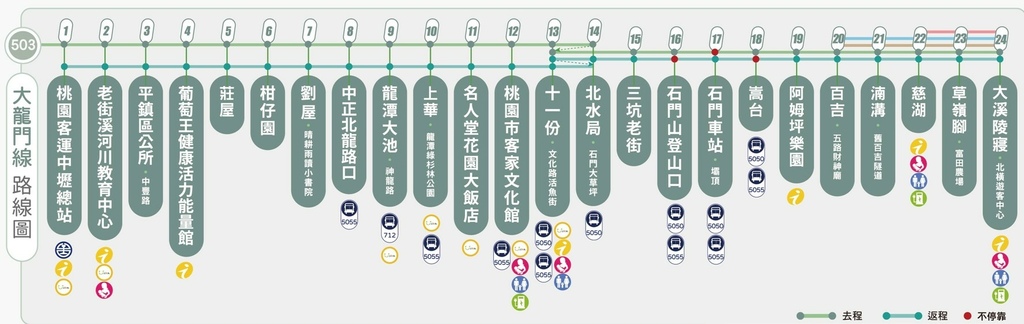 沿途總共停靠24站,終點為大溪陵寢(北橫遊客中心收費站)