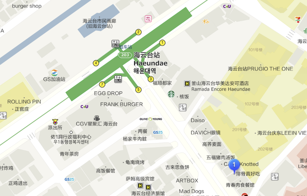 交通方式:地鐵二號線海雲台站3號出口步行約2分鐘