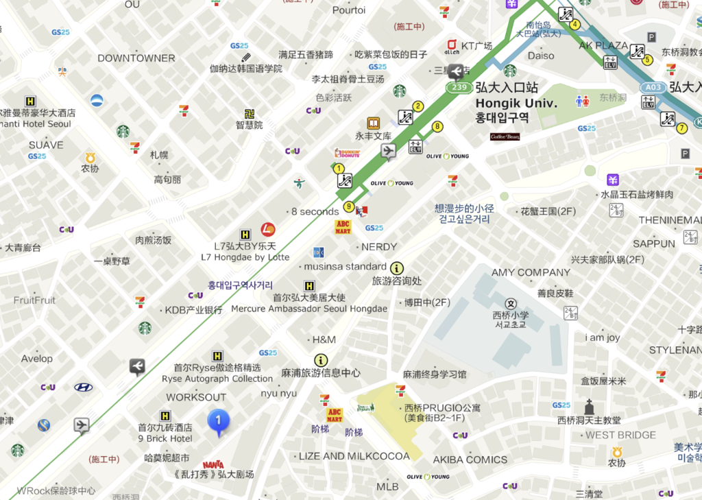 交通方式:首爾地鐵「弘大入口站」9號出口步行約5分鐘