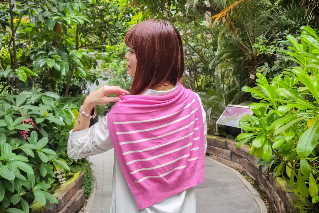 若想增添優雅感當個氣質小姐姐.加上桃紅條紋披肩再拿本書