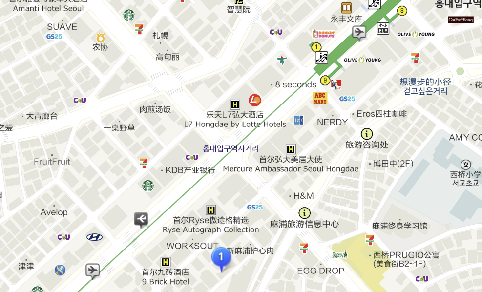 從地鐵二號線弘大入口站8好出口步行過來大約8分鐘左右